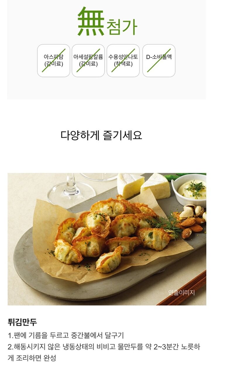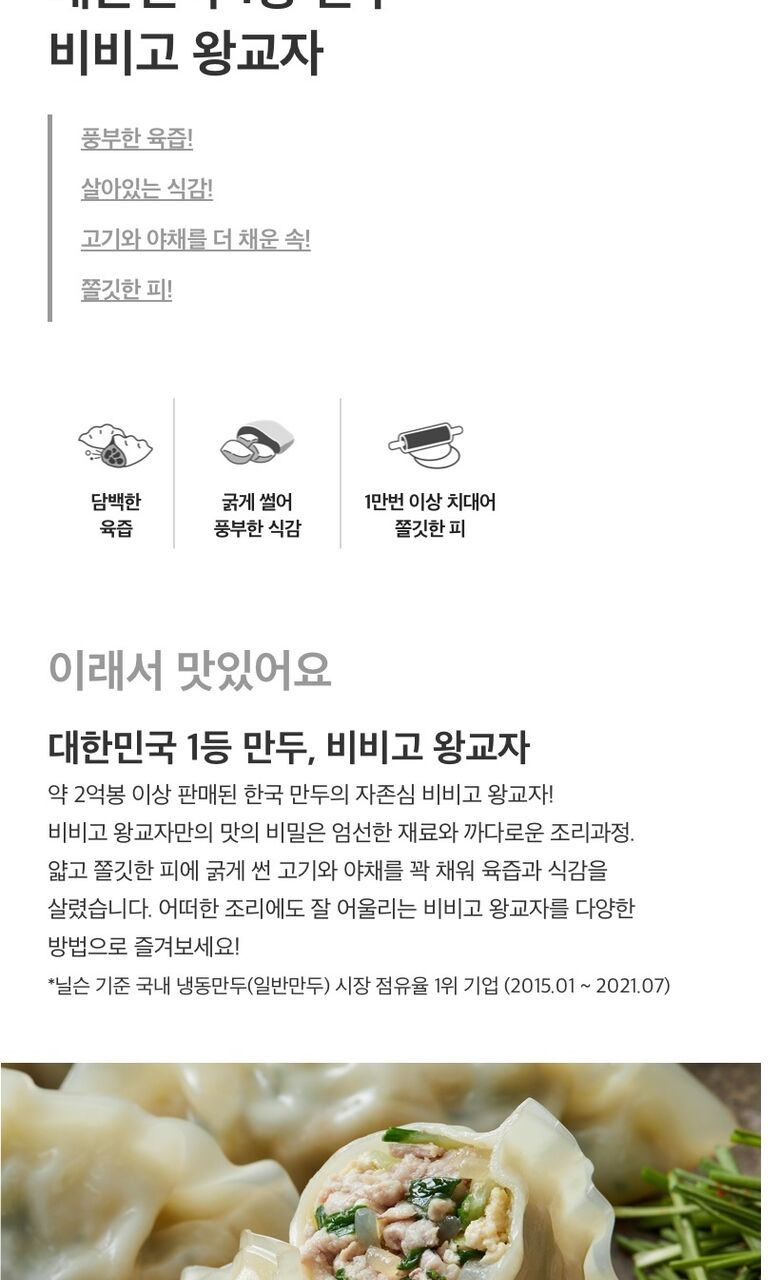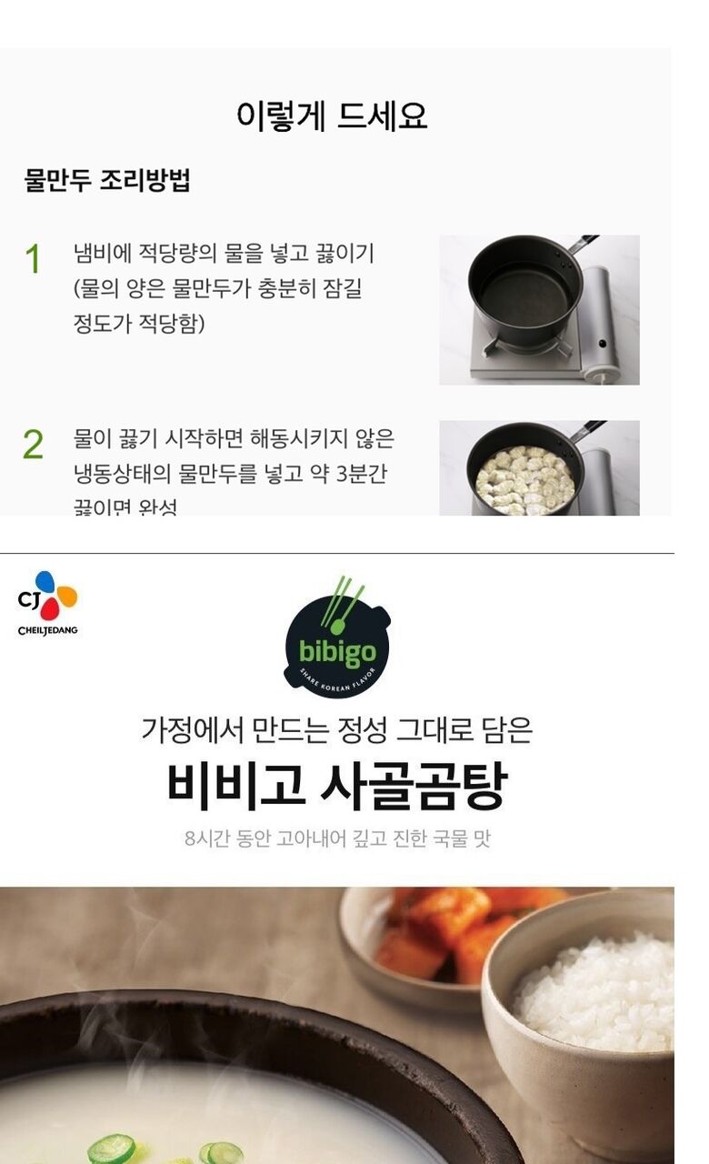 | 제품명 | bibigo비비고왕교자, bibigo새우 왕교자, 비비고 깔끔고기만두, 비비고 진한김치만두, 비비고 물만두, 비비고 사골곰탕 |