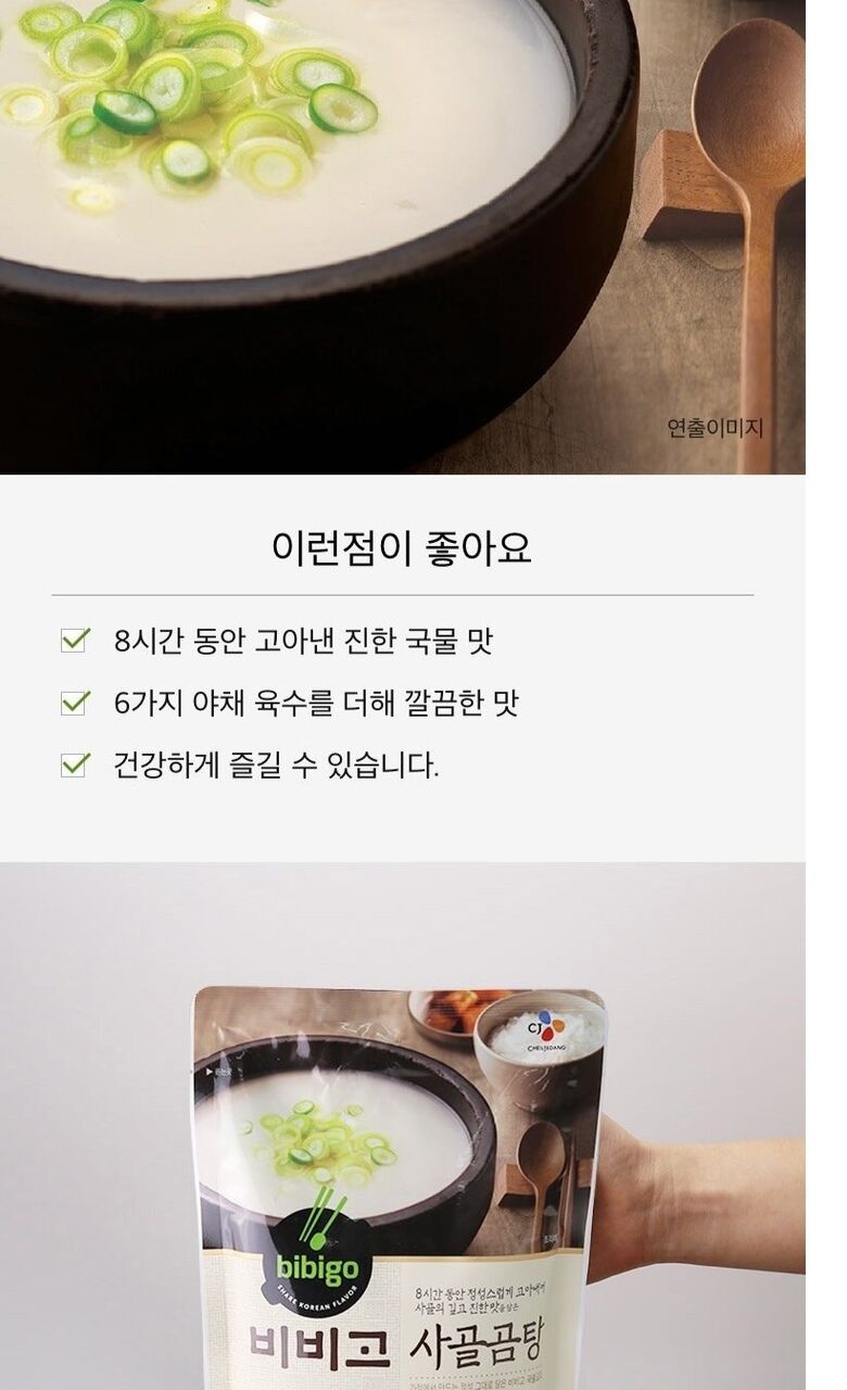| 소비자안전을 위한 주의사항 | 곰탕: 이 제품은 알류, 우유, 메밀, 땅콩, 대두, 밀, 고등어, 게, 새우, 돼지고기, 복숭아, 토마토, 호두, 아황산류, 닭고기, 쇠고기, 오징어, 조개류(굴, 전복, 홍합 포함), 잣을 사용한 제품과 같은 제조시설에서 제조하고 있습니다. 개봉한 제품은 변질된 우려가 있으니 반드시 밀봉 후 냉장 보관하시고 바로 드십시오. 조리 시 안전사고에 주의하십시오. 끓는 물 중탕 시 봉지가 터질 우려가 있으니 냄비 뚜껑을 덮지마십시오. 전자레인지 조리 시 봉지 그대로 넣을 경우 터질 우려가 있으니 전자레인지 용기에 담아서 사용하시기 바랍니다. 가열된 제품은 매우 뜨거워 화상의 우려가 있으므로 주의하십시오. 직접 가열할 경우 육수가 증발 될 우려가 있습니다. 부풀거나 파손된 제품은 드시지 마시고 구입처나 영업소에서 교환하시기 바랍니다. 제품 내 생길 수 있는 하얀물질은 사골에서 유래한 성분이므로 안심하시고 드셔도 되며 개봉 전 충분히 흔들어 주세요. 비비고 사골곰탕이 끓기 전 생고기를 넣을 경우, 국밀이 맑아질 수 있습니다.(비비고 사골곰탕의 주요성분과 생고기 핏물에서 기인한 단백질로 인한것 이니 안심하고 드셔도 됩니다.) 뽀얀 국물 상태로 드시고 싶으신 경우, 익힌 고기를 넣거나 사골곰탕이 팔팔 끓는 상태에서 생고기를 넣어 드시기 바랍니다. 만두 : 이 제품은 알류, 우유, 메밀, 땅콩, 고등어, 게, 새우, 복숭아, 토마토, 아황산류, 호두, 쇠고기, 닭고기, 오징어, 게,조개류(굴,전복,홍합 포함), 잣을 사용한 제품과 같은 시설에서 제조하고 있습니다. 이미 냉동된 바 있으니 해동 후 재냉동시키지 마시길 바랍니다. 반드시 조리하여 익힌 후 드십시오. 찜조리 시 뜨거운 물과 스팀에 주의하십시오. 조리 시 조리기구가 과열될 수 있으니 꼭 자리를 지켜 조리과정을 확인하십시오. 프라이팬 조리 시 기름이 튈 수 있으니 주의하십시오. 필요한 양만큼 꺼내어 사용하신 후 남은 제품은 냉동실에 바로 보관하십시오. 보관방법 미준수 시에는 변질 등의 우려가 있으니 보관조건을 지켜주시기 바랍니다. 양파, 대파를 사용하여 해당 원료의 얇은 막이 있을 수 있습니다. 에어프라이어 조리 시 에어프라이어 사양에 따라 조리 편차가 날 수 있습니다. 제품 표면의 검은 점은 콩의 씨눈이므로 안심하고 드셔도 됩니다. 만두 피와 속의 까만 점처럼 보이는 부분은 후춧가루이오니 안심하고 드시길 바랍니다. |