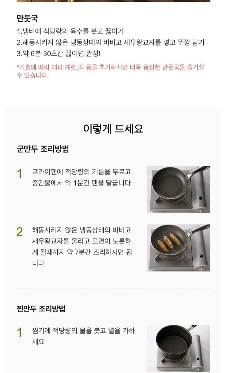 | 제조연월일, 소비기한 또는 품질유지기한 | 왕교자, 새우왕교자, 물만두, 수제깔끔고기만두, 수제진한김치만두: 22년 10월 이후 제조(제조일로부터 9개월) /사골곰탕: 22년 9월 이후 제조(제조일로부터 12개월) |